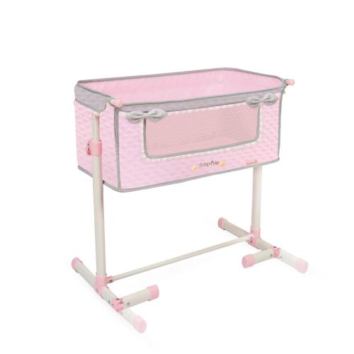 O berço de boneca Sleep with me tem um tecido acolchoado. Inclui laços acolchoados, pormenores bordados e botões decorativos em madeira natural.