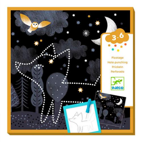 Escolha um fundo e um animal para revelar. Depois, prenda as 2 folhas no suporte. Utilizando a ferramenta, faça furos seguindo os pontos dos modelos. Coloque uma fonte de luz por detrás do seu fundo: surpresa, o animal aparece!